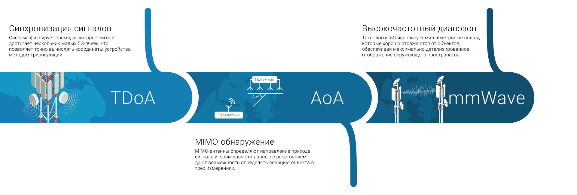 Позиционирование по углу прихода и углу отправки (AoA/AoD - Angle of Arrival/Departure): Massive MIMO-антенны 5G способны определять, под каким углом сигнал пришел от устройства или под каким углом его нужно отправить. Комбинируя данные о углах от нескольких станций, система с геометрической точностью «рисует» местоположение объекта.