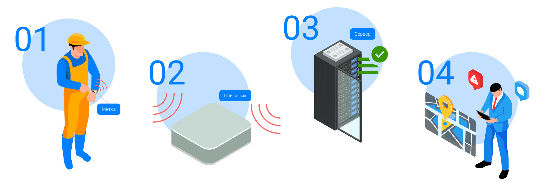 Простота внедрения — легко масштабируется для различных сценариев: трекинг оборудования, сотрудников или других активов.