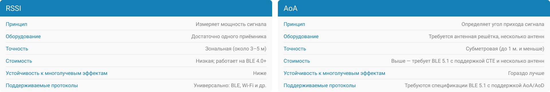 Одной из альтернатив RSSI является AoA (Angle of Arrival, угол прибытия сигнала). Вот ключевые отличия:
