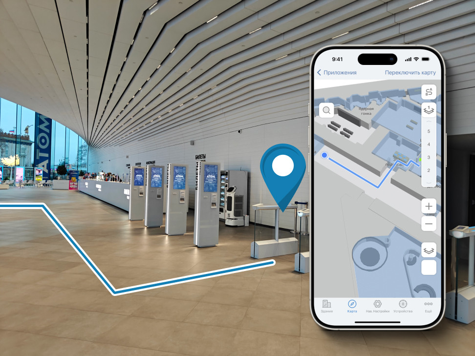 Индорс Навигейшн реализовала проект по интеграции современной системы цифровой навигации в одном из новых музеев на ВДНХ — «АТОМ». Внедрение было направлено на решение ключевой проблемы сложной планировки и этажности пространства, с которой сталкивались посетители, часто теряя ориентацию и тратя время на поиск нужных залов или выходов.
